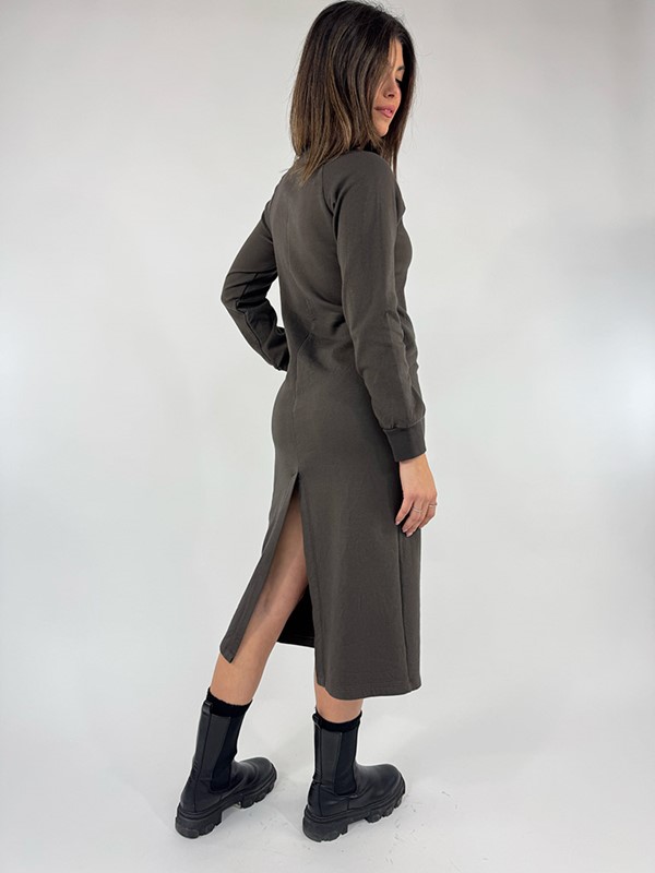 Abito in felpa strass a girocollo. Modello sotto al ginocchio, leggermente aderente, in tessuto doppiato, morbidissimo sulla pelle, non felpato e non garzato. Sulla parte dietro presenta un ampio spacco centrale. Larghezza seno 44 cm, lunghezza dlla spalla 115 cm. Composizione: 90% cotone 5% poliestere 5% elastan. Made in Italy.