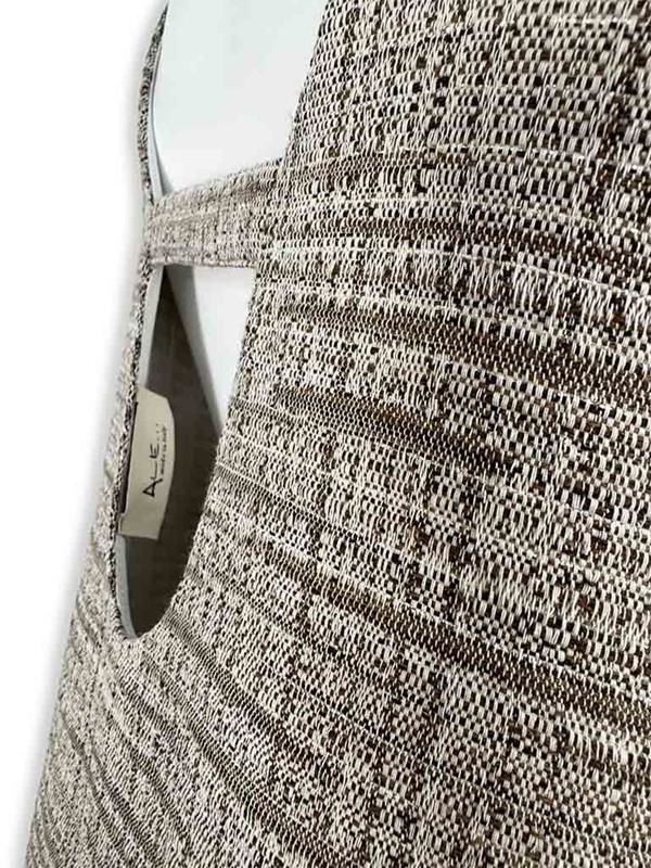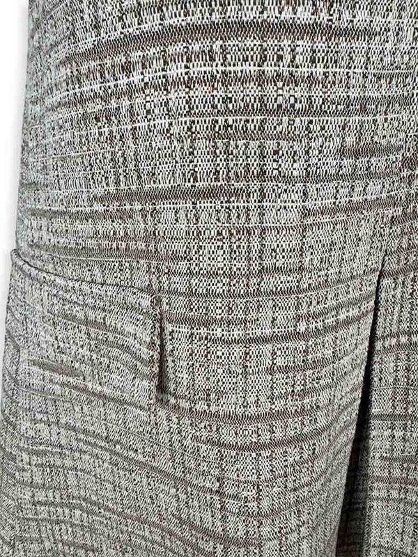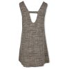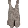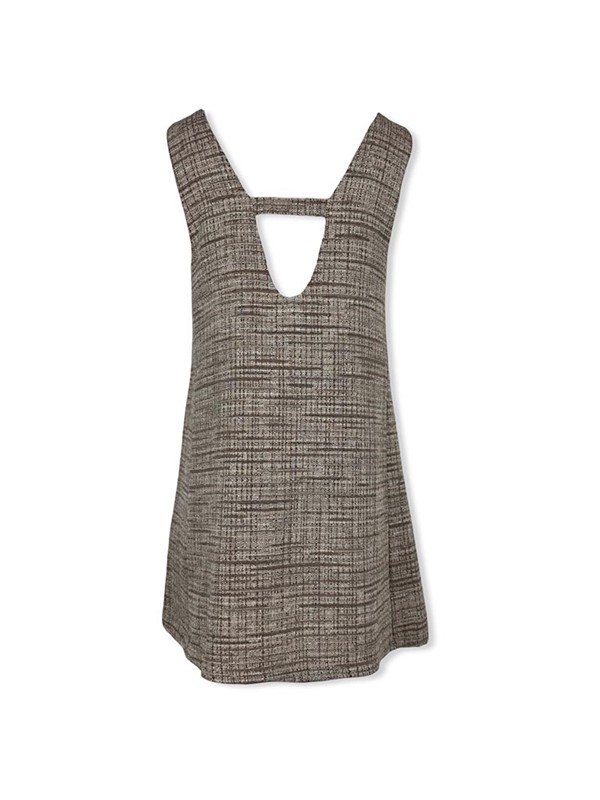 Abito salopette in tweed, fit sagomato, modello corto con finto spacco davanti. Profondo scollo davanti e dietro, con fascetta posteriore. Finte taschine sul davanti, leggermente svasato in fondo, foderato. Nella trama del tessuto è presente un filo argentato. Composizione: 86% cotone 9% poliammide 5% altre fibre. Made in Italy.