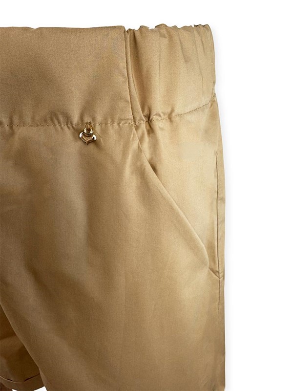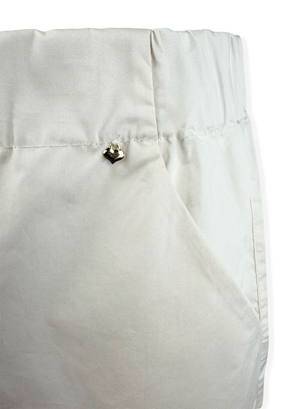 Bermuda leggero con elastico in popeline di cotone. Modello non cortissimo, con elastico in vita, fit comodo. Piccolo ciondolo a forma di cuore sul lato sinistro. Comode tasche alla francese. Senza tasche dietro. Tg. S larghezza vita 44 cm, lunghezza dalla vita 46 cm. Composizione: 100% cotone. Made in Italy.