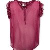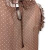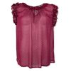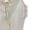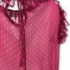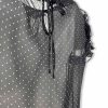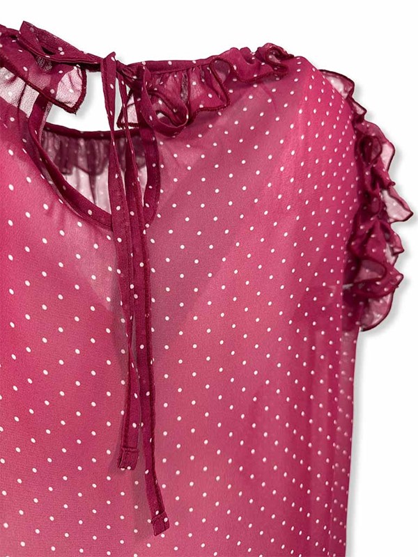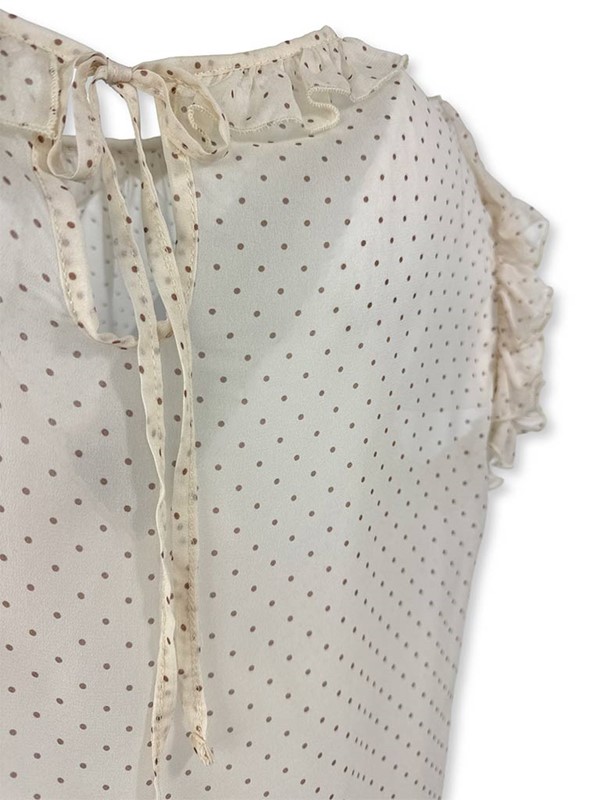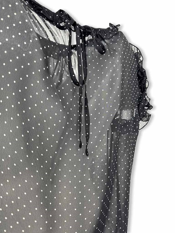Blusa senza maniche frappe. Modello a scatola, tessuto leggermente trasparente con motivo di piccoli pois. Ruche nel giromanica e nel collo. Allacciatura posteriore con laccetto e goccia. Larghezza seno 54 cm, lunghezza dalla spalla 59 cm. Composizione: 100% viscosa. Made in Italy.