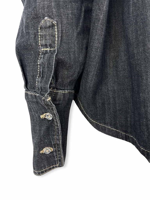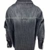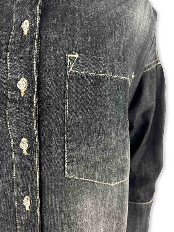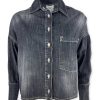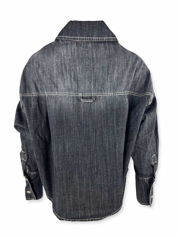 Camicia denim cropped. Lavaggio nero effetto washed dal taglio moderno e rilassato. Collo classico, chiusura frontale con bottoni e asole, grande tasca sul lato sinistro. Modello corto e ampio, leggermente più lungo dietro. Le cuciture a contrasto e lavaggio vissuto donano un carattere grintoso e versatile. Ideale da indossare come camicia casual oppure come giacca leggera sopra t-shirt e canotte. Tg S larghezza seno 65 cm, lunghezza dalla spalla 48 cm. Composizione: 100% cotone. Made in Italy.
