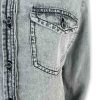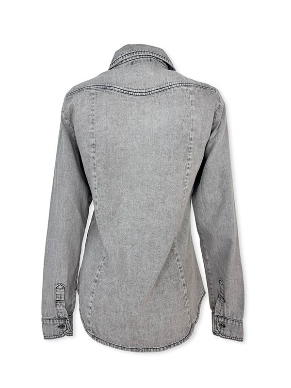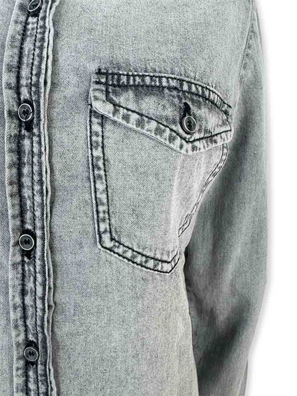 Camicia denim texana, fit sfiancato. Lavaggio grigio con scoloriture, tela ferma. Il modello presenta due taschine davanti, manica asciutta. Chiusura con asole e bottoncini. Tg S larghezza seno 43 cm, lunghezza dalla spalla 60 cm. Composizione: 100% cotone. Made in Italy.