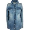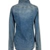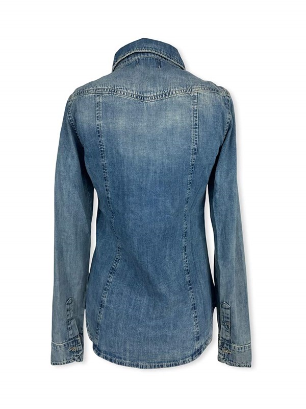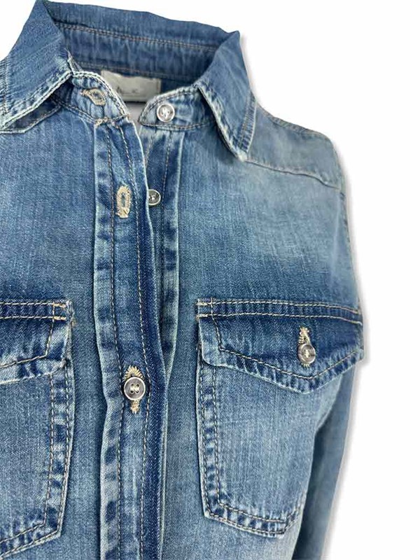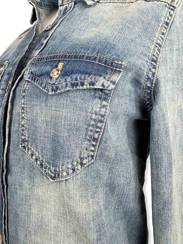 Camicia jeans texana, fit sfiancato. Lavaggio intermedio con scoloriture, tela ferma. Il modello presenta due taschine davanti, manica asciutta. Chiusura con asole e bottoncini. Tg S larghezza seno: 43 cm, lunghezza dalla spalla 60 cm. Composizione: 100% cotone. Made in Italy.