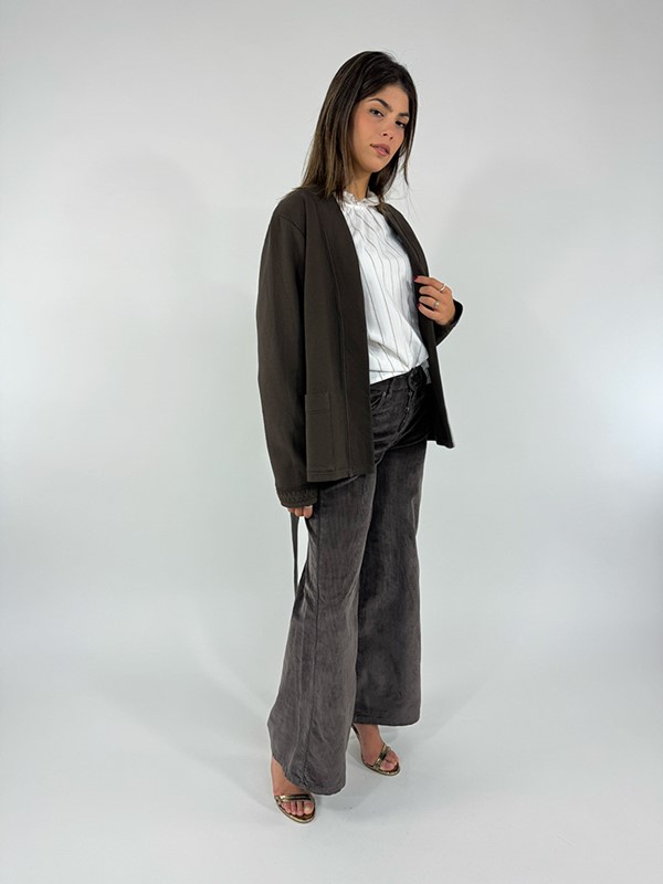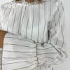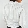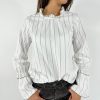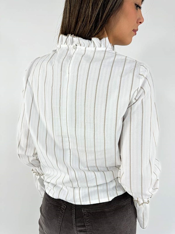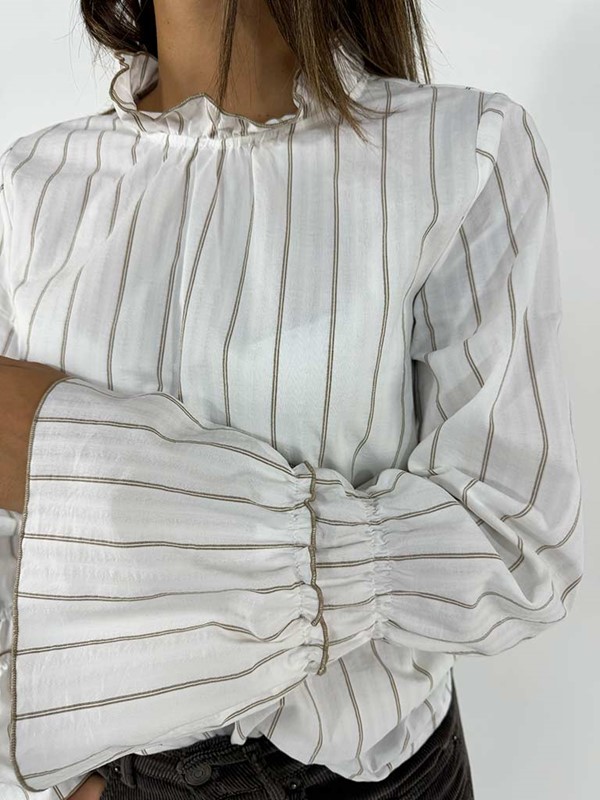 Camicia manica campana in cotone. Modello con collo a galetta ed elastico nei polsi. Fit a scatola, non sagomato. La modella è alta 170 cm e indossa la tg S. Larghezza seno 50 cm. Lunghezza dalla spalla 57 cm. Composizione bianca: 100% cotone. Composizione gessata: 100% viscosa. Made in Italy.