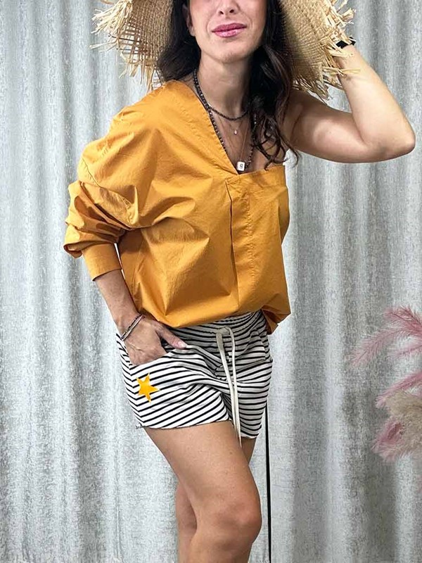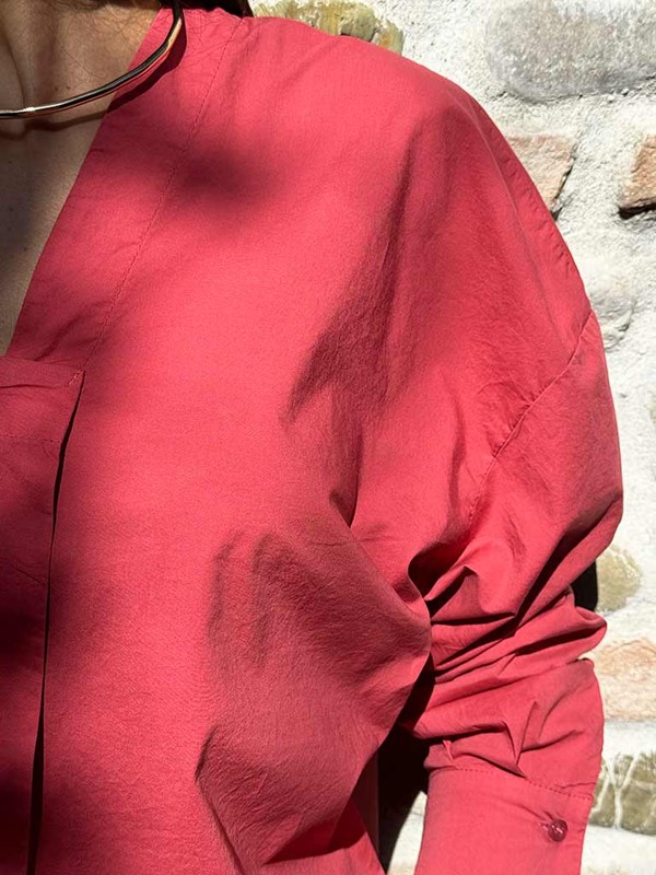 Camicia monospalla in 100% cotone. Modello a scatola con una manica a palloncino. Polsino con bottone. Cucitura centrale davanti. Vestibilità 40/46. La modella è alta 170 cm. Composizione: 100% cotone. Made in Italy.