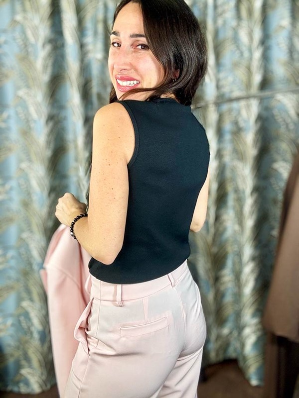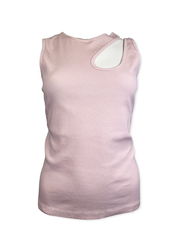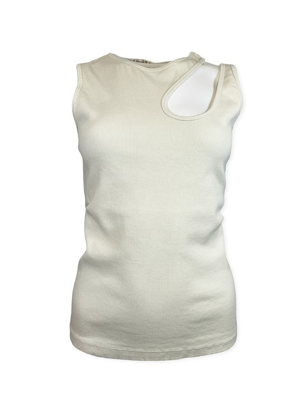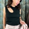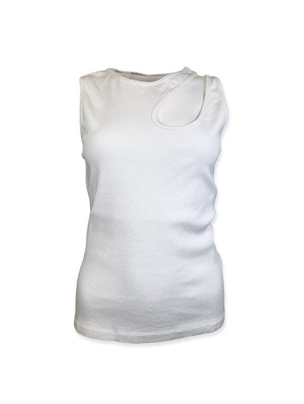 Canotta a costine con goccia in cotone. Modello cut-out con apertura sul decolletè, fit leggermente aderente, vestibilità 38/44. Ideale sottogiacca. Composizione: 97% cotone 3% elastan. Made in Italy.