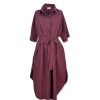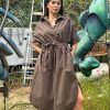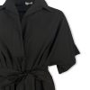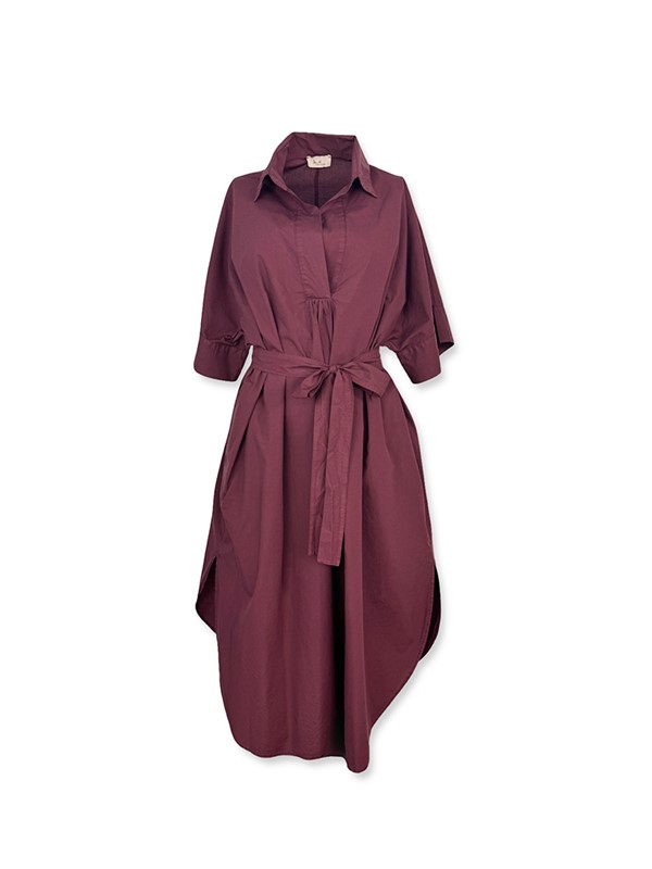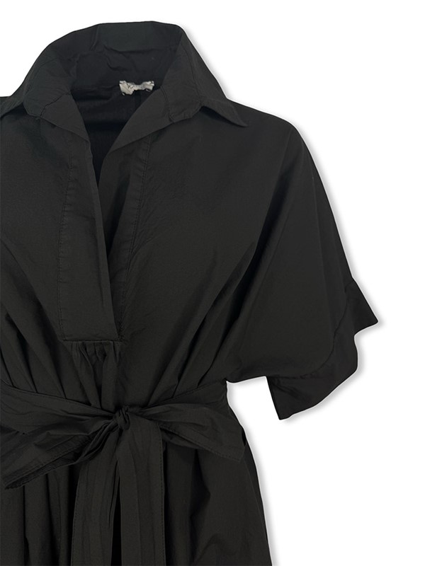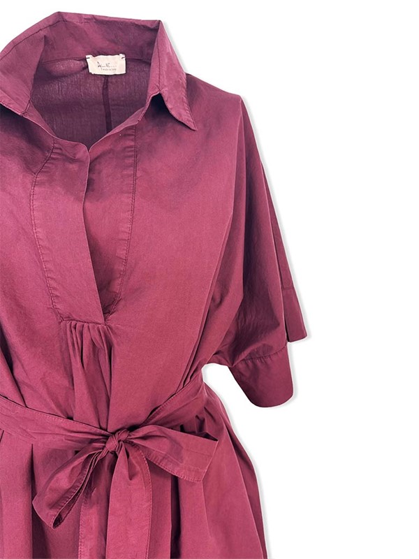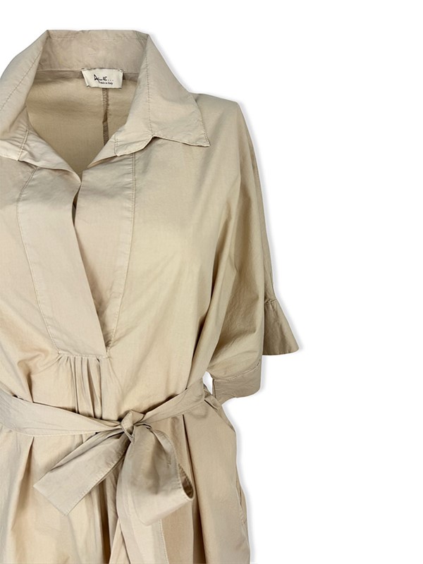 Chemisier con cintura per modellare il punto vita, fit molto ampio, tessuto leggerissimo, stondato in fondo. Collo a V con colletto, manica corta ampia e tasche a filo sui fianchi. Vestibilità 40/46. Composizione: 100% cotone. Made in Italy.