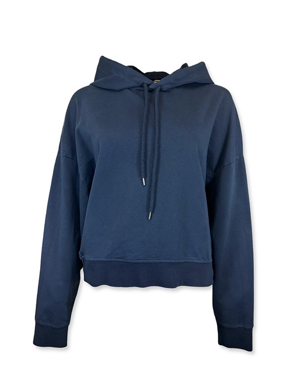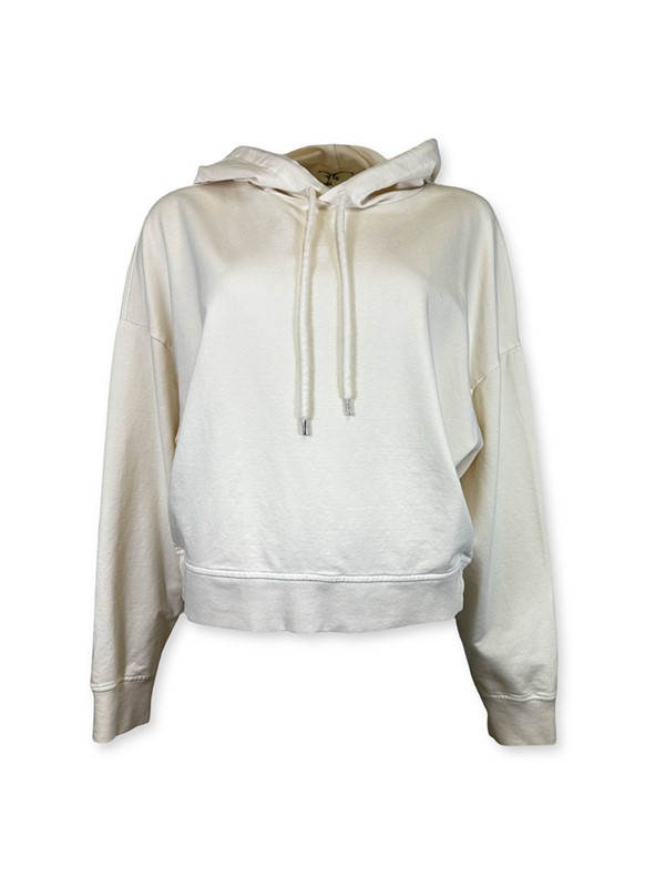 Felpa over con cappuccio, modello crop con fascioncino e spalla scesa. Vestibilità 38/44. Composizione: 95% cotone 5% elastan. Made in Italy.