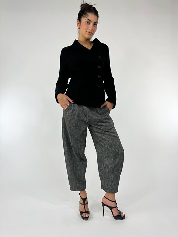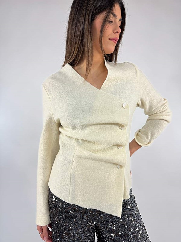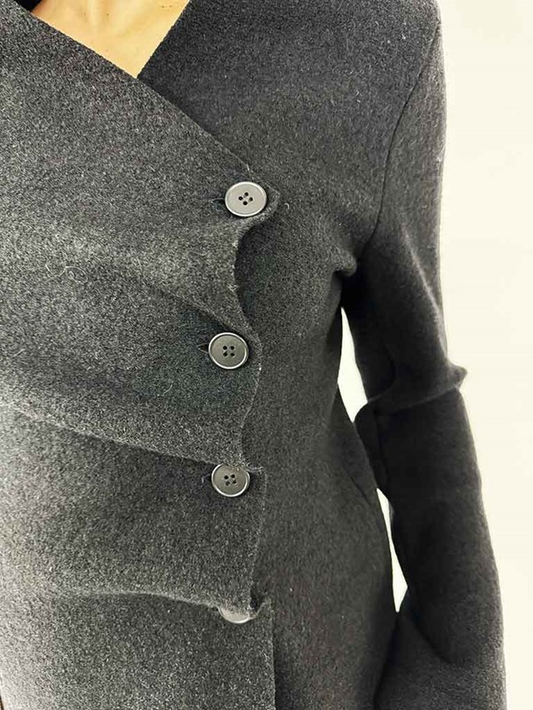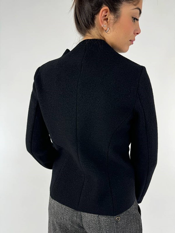 Giacca 100% lana con arricciatura laterale e taglio vivo. Modello sfoderato senza spalline, adatto anche come capo spalla. Gioco asimmetrico se portata aperta. La modella è alta 170 e indossa la tg S. Composizione: 100% lana. Made in Italy.