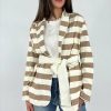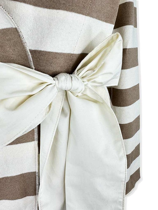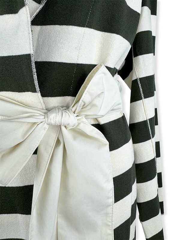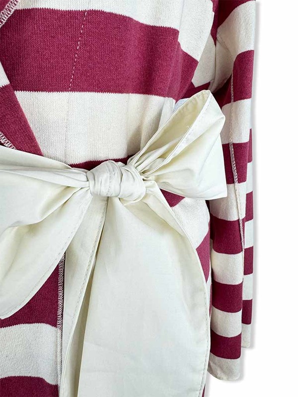Giacca a righe in felpa con fusciacca in vita. Modello aperto, senza bottoni, collo a revere e cuciture con tagliacuci. Vestibilità 40/46. Composizione: 100% cotone. Made in Italy.