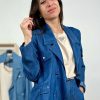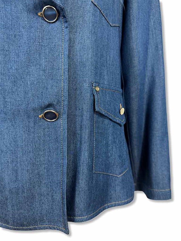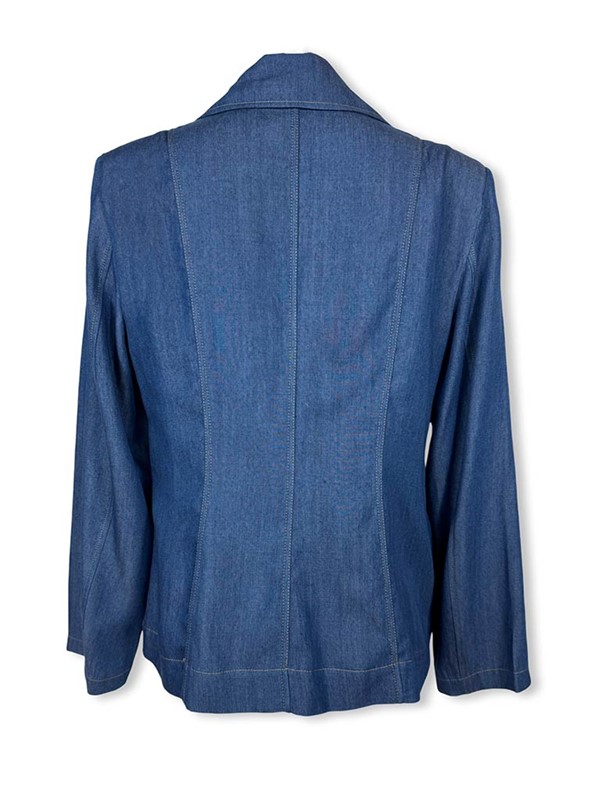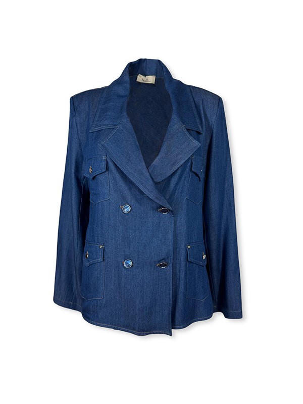 Giacca doppiopetto in tencel. Modello con collo revere e manica lunga. Blazer super leggero, sfoderato. Chiusura frontale a doppiopetto con bottoni metallici e motivo di 4 taschine. Tg S: larghezza seno 47 cm, lunghezza dalla spalla 58 cm. Composizione: 100% tencel. Made in Italy.