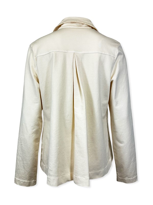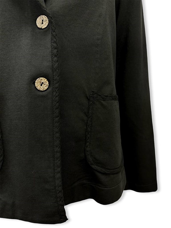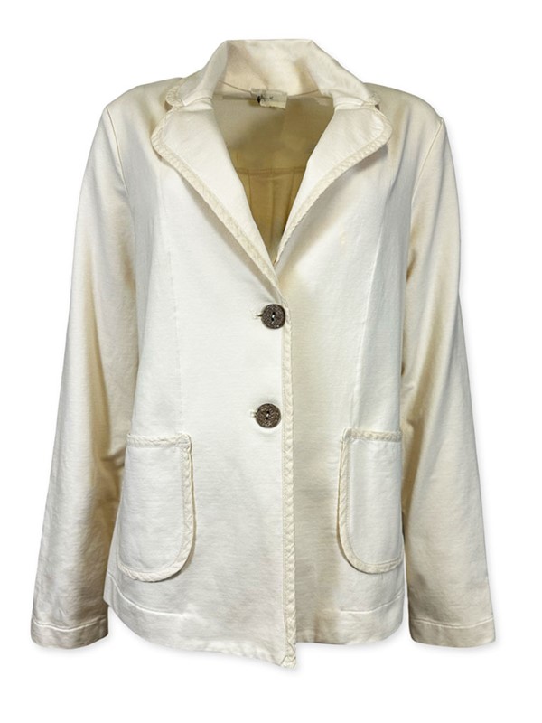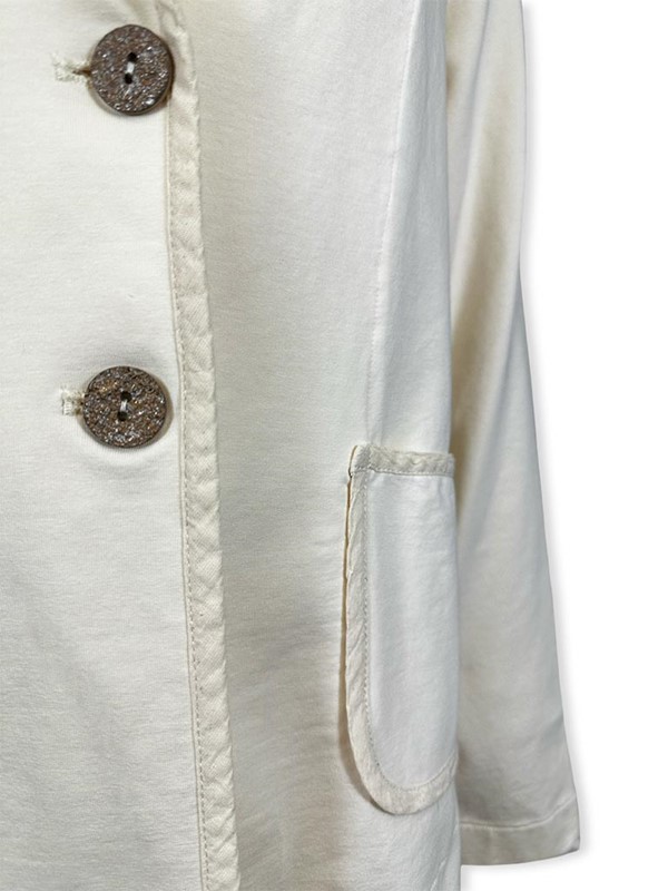 Giacca felpa over con bordi in cotone grogrè. Modello molto versatile per uso quotidiano, perfetta per l’ufficio e il tempo libero. Chiusura con due bottoni microbrillantinati e collo a revère. Lunghezza al fianco, fit comodo. Presenta due taschine a toppa davanti e una piega morbida usata per dare ampiezza e movimento sulla schiena. Cotone leggero elasticizzato. Vestibilità 40/46. Composizione: 95% cotone 5% elastan. Made in Italy.