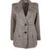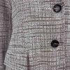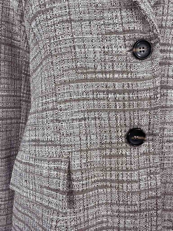 Giacca lunga in tweed sfoderata, senza spacco dietro. Fit sfiancato, con lunghezza sotto ai fianchi. Allacciatura centrale, con due bottoni, collo a revere. Nella trama del tessuto è presente anche un filo argentato. Composizione: 86% cotone 9% poliammide 5% altre fibre. Made in Italy.