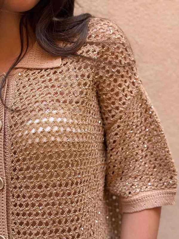 Giacchina con bottoni a rete pailettes. Modello traforato a manica corta e apertura centrale con bottoni e collo a camicia. Presenta due tasche sul davanti. Fit morbido. Lavorazione con micropailettes applicate. Vestibilità 40/46. Larghezza seno 62 cm, lunghezza dalla spalla 61 cm. Composizione: 70% poliestere 30% poliammide. Made in Italy.