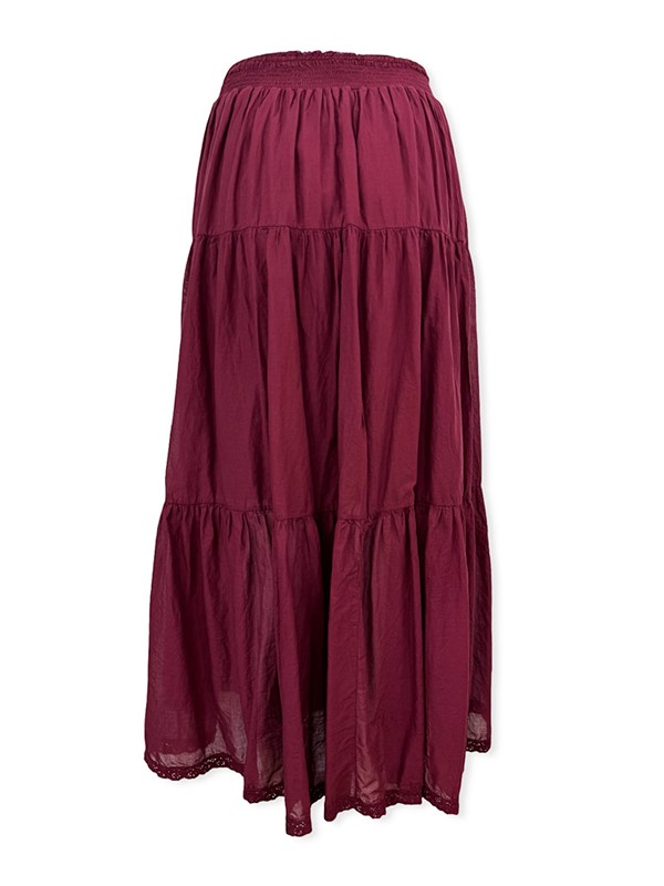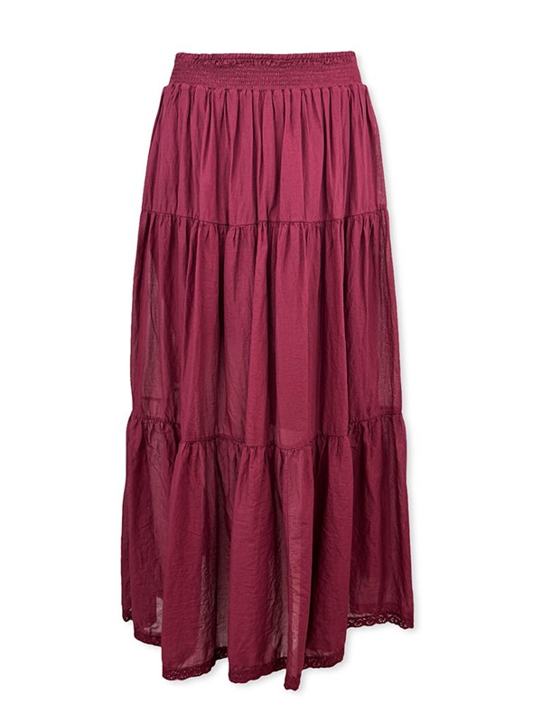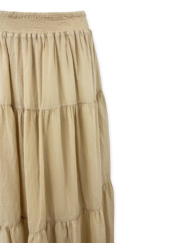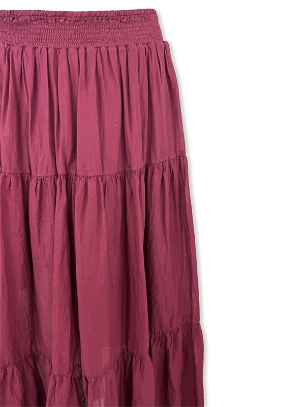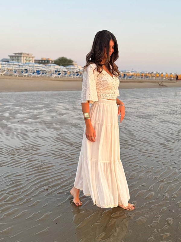 Gonna in mussola a balze in cotone leggerissimo. Modello con comodo elastico in vita, lunghezza ai piedi. Foderata, leggermente trasparente nella parte in fondo. Vestibilità 40/44. Composizione: 100% cotone. Made in Italy.