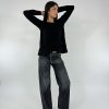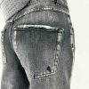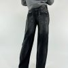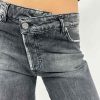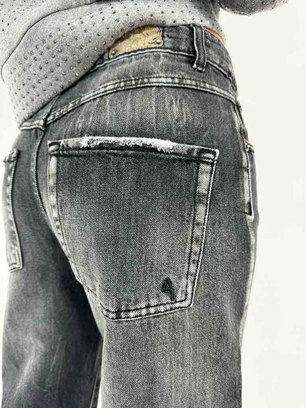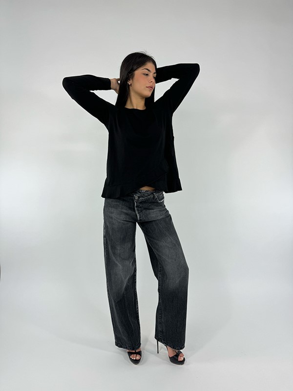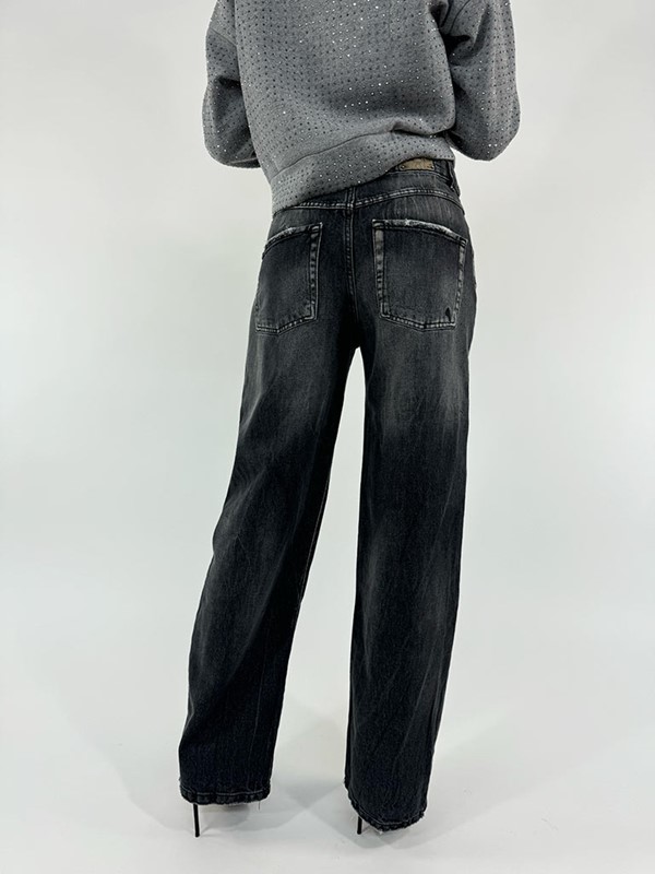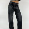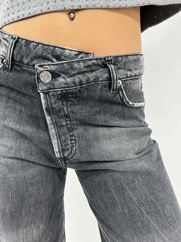 Jeans largo chiusura bottoni. Lavaggio stone wash sdrucito, tela ferma non elasticizzata. Modello a vita bassa con cavallo sceso, chiusura con bottoni incrociata. Vestibilità morbida. Composizione: 100% cotone. Made in Italy.