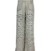 Jeans laserato invecchiato, modello 5 tasche, tela ferma, non elasticizzato. Nella parte alta non presenta rotture, modello a gamba larga, fit morbido. La tela può presentare delle discromie più o meno evidenti e questo è da considerarsi una caratteristica di pregio e non un difetto. Tg 42 larghezza vita 43 cm, lunghezza dal cavallo 77 cm. Composizione: 100% cotone. Made in Italy.