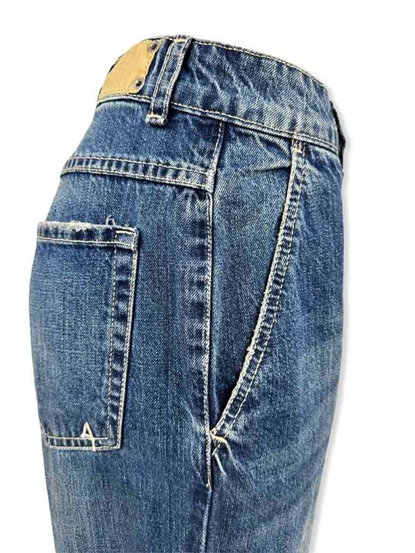 Jeans mom-fit tasca america, tela ferma. Modello con vita alta, gamba morbida, più stretto in fondo e cucitura centrale in basso. Chiusura con bottone e zip. Tg 40 larghezza vita 37 cm, lunghezza dal cavallo 66 cm. Composizione: 100% cotone. Made in Italy.