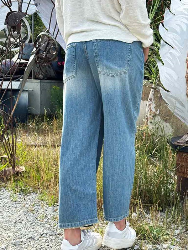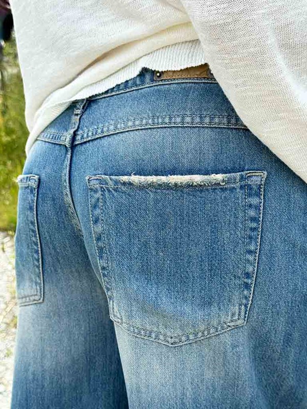 Jeans morbido egg-fit, capo new trend. Modello con cavallo sceso, leggermente più stretto in fondo. Lavaggio sabbiato con effetto sdrucito negli orli. Tela ferma, morbidissima e leggera. La modella è alta 170 cm e indossa la tg 42. Composizione: 55% cotone 45% tencel. Made in Italy.