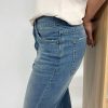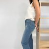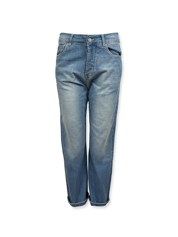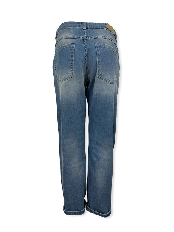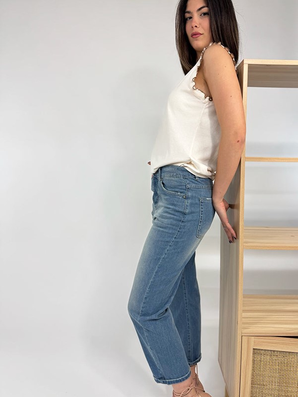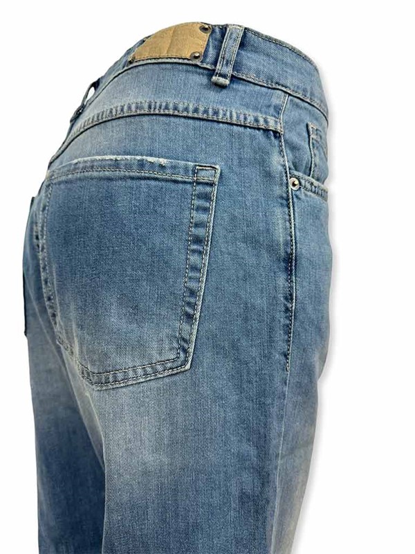 Jeans relaxed elasticizzato, lunghezza alla caviglia. Lavaggio sabbiato, senza abrasioni. Chiusura con bottoni. Fit morbido nella gamba, più stretto alla caviglia. Tela molto confortevole, leggerissima. La modella indossa la tg 42: larghezza vita 38 cm, lunghezza dal cavallo 63 cm. Composizione: 98% cotone 2% elastan. Made in Italy.