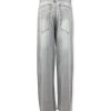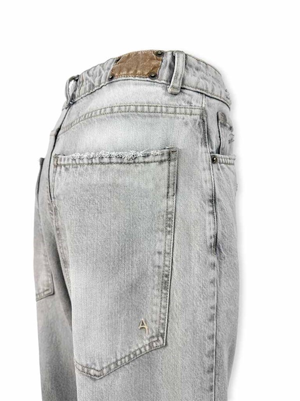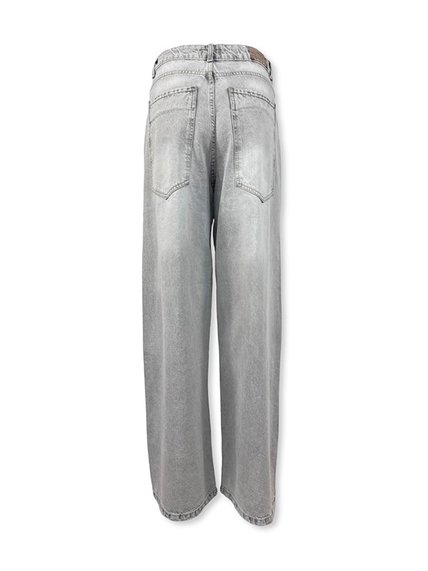 Jeans wide con tasche over. Modello a gamba larga, lavaggio grigio chiaro con abrasioni. Chiusura con bottone e zip. La modella è alta 170 cm e indossa la tg 40. Lunghezza dal cavallo 79 cm. Composizione: 100% cotone. Made in Italy.
