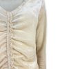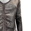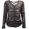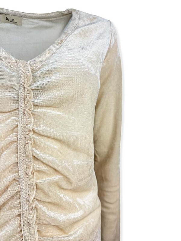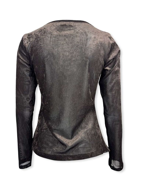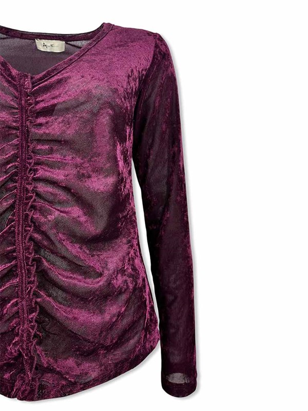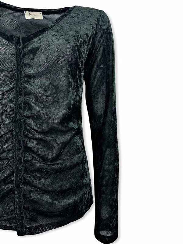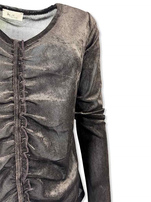 Maglia in tulle di ciniglia a manica lunga. Modello slim, con arricciatura centrale. Tulle elasticizzato, floccato, cangiante. Vestibilità 38/44. Composizione: 90% poliestere 10% elastan. Made in Italy.