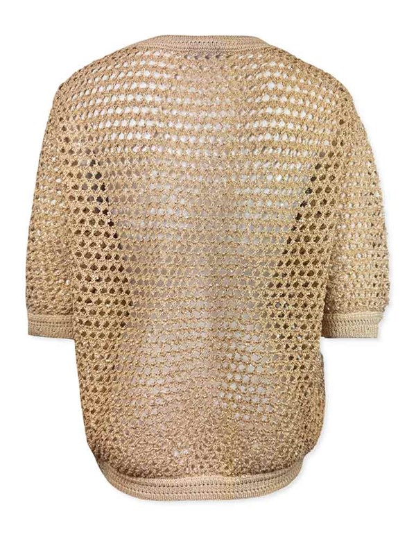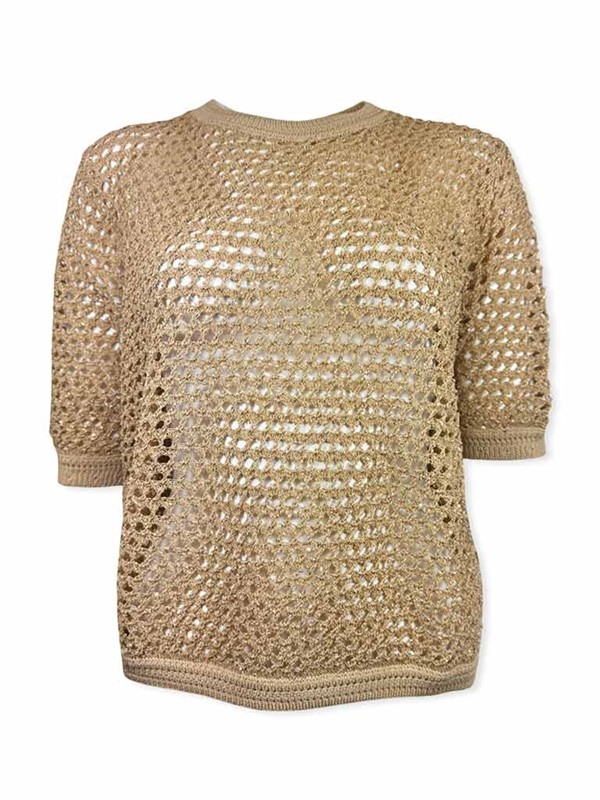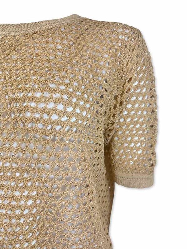 Maglia m/corta a rete e paillettes. Modello a girocollo traforato, con cannettè in basso e nelle maniche. Stile romantic chic. Il filato presenta una micropaillettes molto fine tono su tono. Fit morbido, vestibilità 38/44, larghezza seno 59 cm, lunghezza dalla spalla 53 cm. Composizione: 70% poliestere 30% poliammide. Made in Italy. Made in Italy.