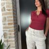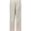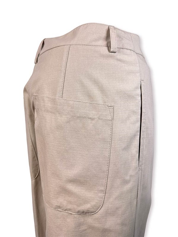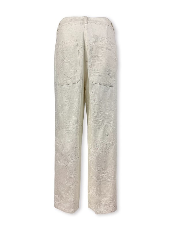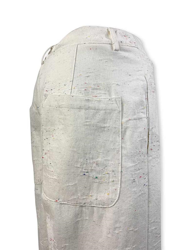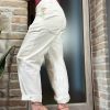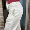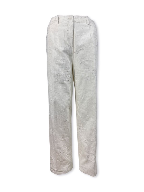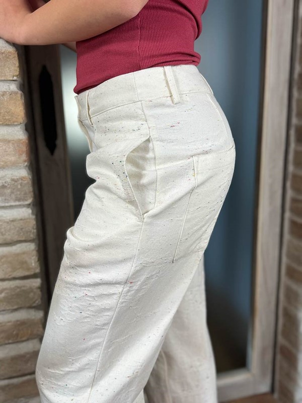 Pantalone baggy in cotone con fascioncino e chiusura con bottone e zip. Modello a vita medio alta, con cavallo sceso, più stretto in fondo. Tessuto in cotone fermo. La modella è alta 170 cm e indossa la tg 42. Lunghezza dal cavallo 72 cm. Composizione 100% cotone. Made in Italy.