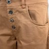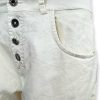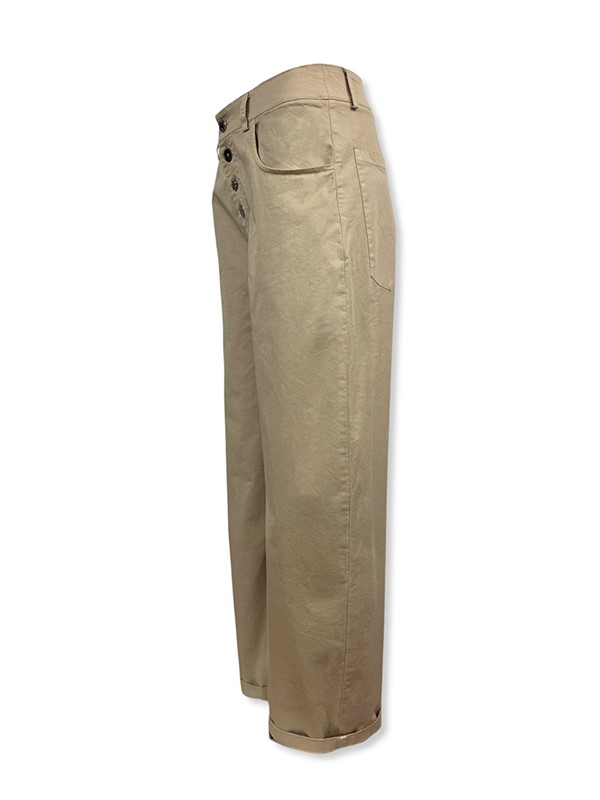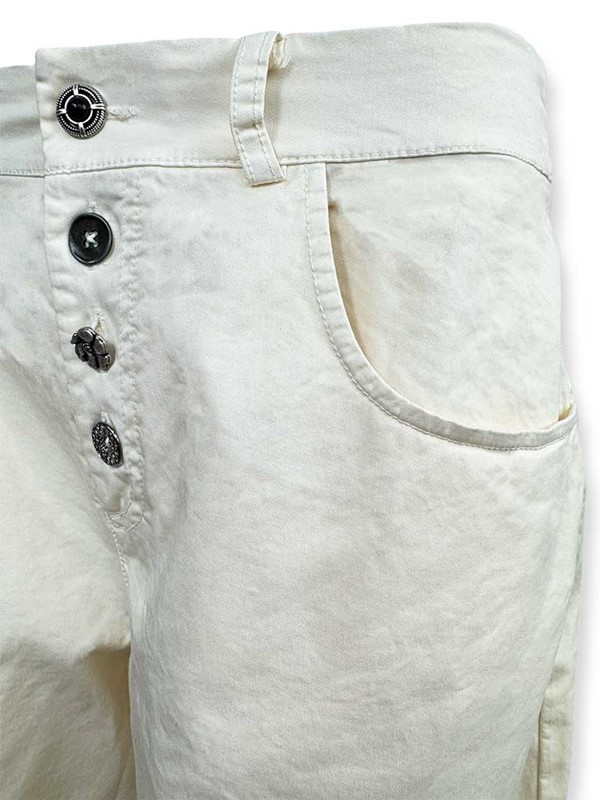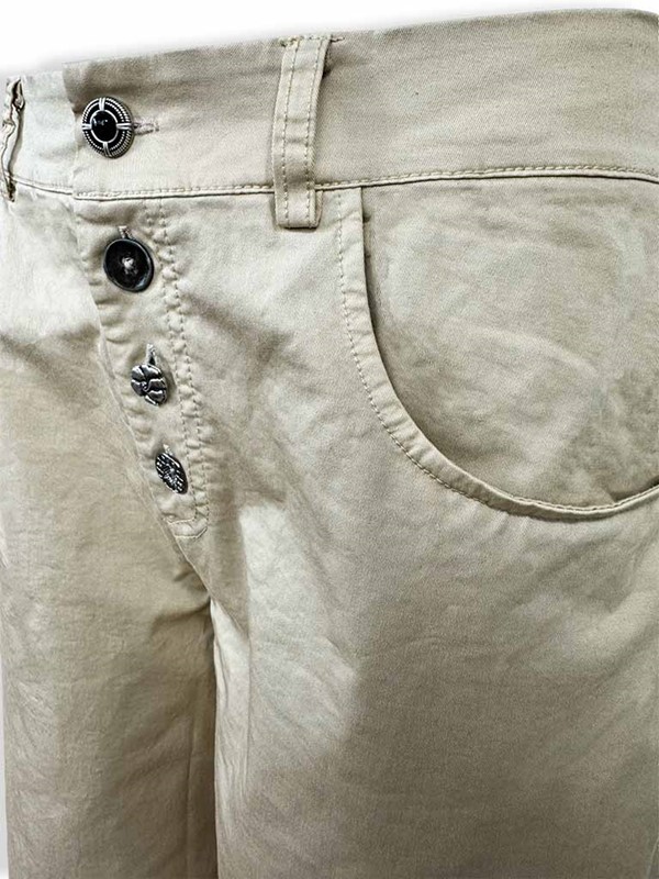 Pantalone con bottone a fiore in cotone leggermente elasticizzato. Modello baloon, super tendenza, con bottoni in metallo a vista, di diverse forme. Vestibilità regolare, tg S larghezza vita 38 cm, lunghezza dal cavallo 70 cm. Composizione: 95% cotone 5% elastan. Made in Italy.