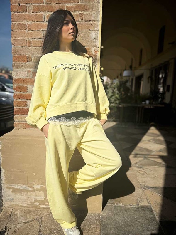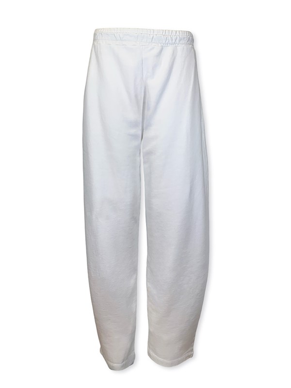 Pantalone in felpa balloon baggy con elastico in vita. Modello lungo a gamba curva. Felpa garzata di cotone leggero, molto confortevole. Vestibilità 40/44. La modella è alta 170 cm. Composizione: 100% cotone. Made in Italy.