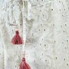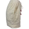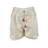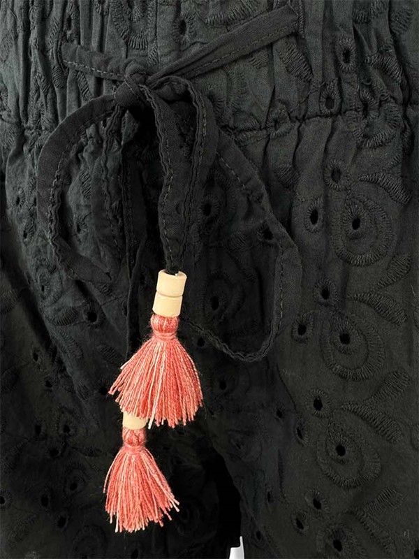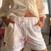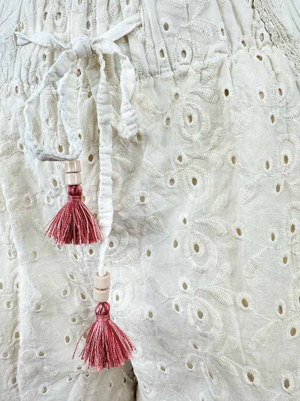 Short in sangallo con nappine, modello con elastico e couilisse in vita. Fit morbido, foderato internamente, non trasparente. Tasche america rifinite con piccola passamaneria. La modella è alta 170 cm e indossa la tg S. Composizione: 100% cotone. Made in Italy.