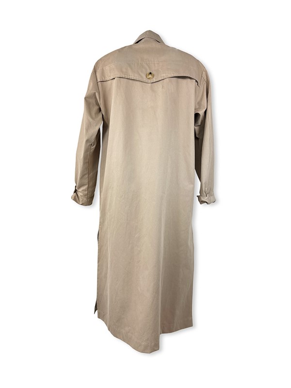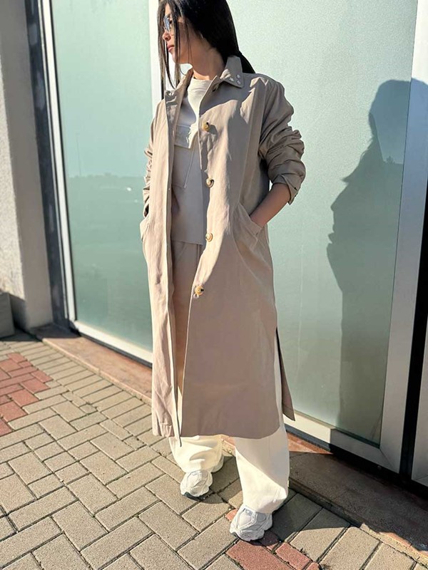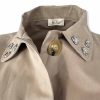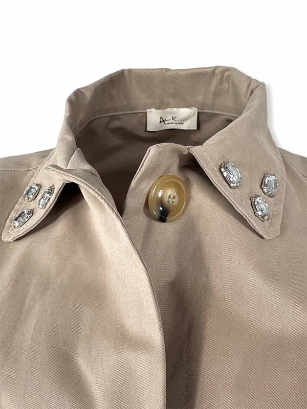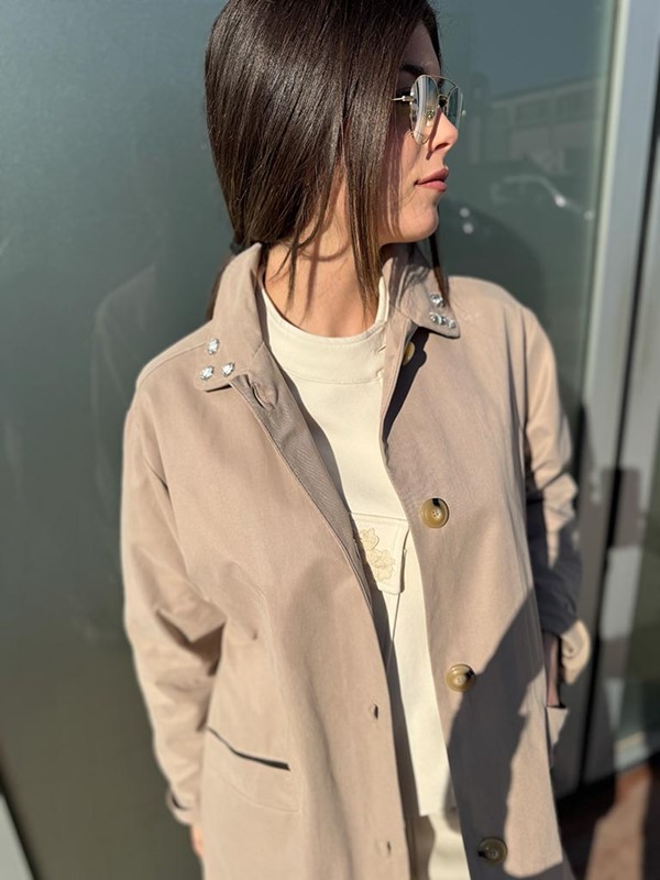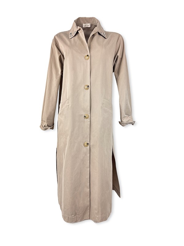 Spolverino lungo con pietre e spacco alto laterale. Modello trench non sfiancato, lunghezza sotto il ginocchio. Colletto con pietre cucite. Chiusura con bottoni, due tasche davanti. Doppio bottone nel polso per creare l’effetto manica arricciata. Composizione: 60% cotone 32% poliestere 8% poliammide. Made in Italy.
