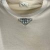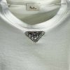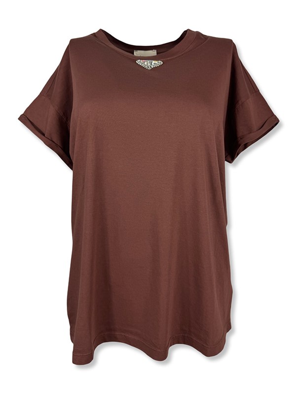 T-shirt con triangolo strass e pietre. Modello a scatola, non aderente. Larghezza seno 53 cm, lunghezza dalla spalla 61 cm. Vestibilità 40/46. Composizione: 100% cotone. Made in Italy.