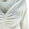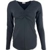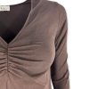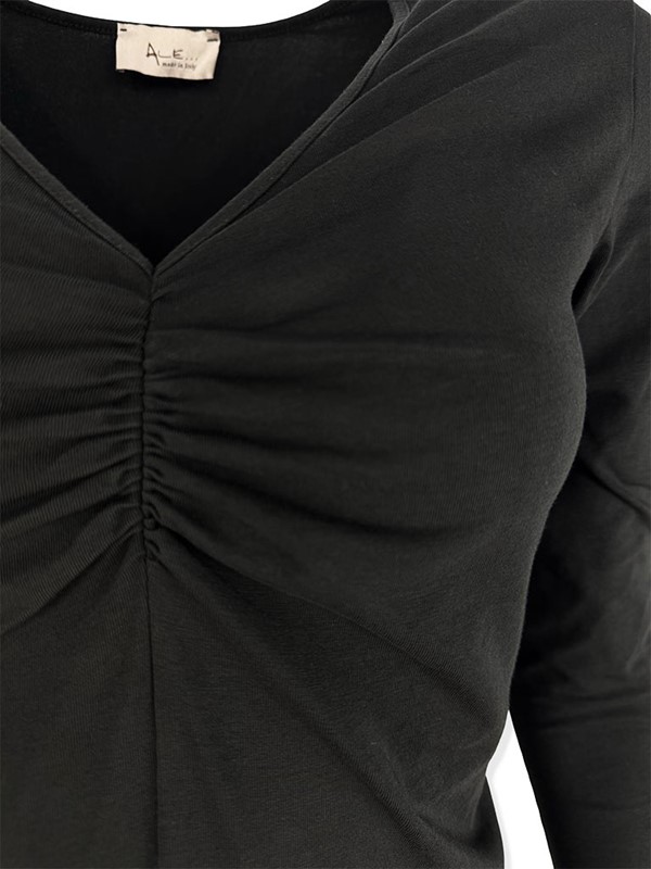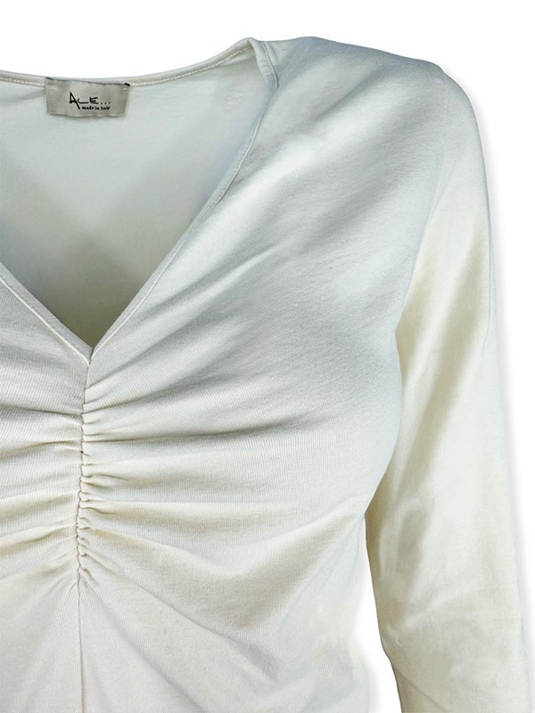 T-shirt scollo a V con arricciatura centrale e a manica lunga. Fit aderente. Vestibilità 38/44. Composizione: 90% cotone 10% elastan. Made in Italy.